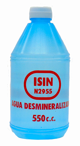 El Agua Desmineralizada ISIN es el complemento ideal para el electrolito de las baterías.Para que las placas reciban o generen corriente, las placas positivas y negativas deben encontrarse sumergidas en un liquido llamado ELECTROLITO. el cual esta compuesto por agua desmineralizada y ácido sulfúrico.El agua es el único elemento que se evapora. Al presentarse un nivel bajo de electrolito, debe añadirse agua desmineralizada; en caso contrario, puede dejar al descubierto parte de las placas generando el deterioro de estas y reduciendo el rendimiento de la batería.