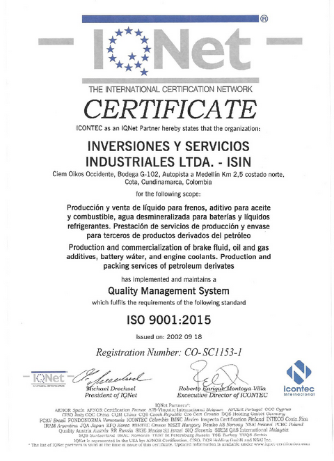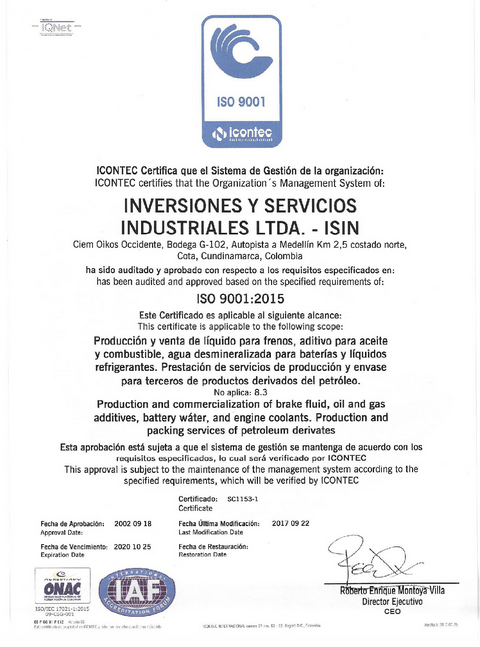 Dando cumplimiento a los requisitos de las diferentes normas, desde el 2002 contamos con el certificado ISO 9001 - Sistema de Gestión de la Calidad y desde el 2006 con el Sello de Calidad para el producto de Liquido para Frenos, convirtiéndonos en la única empresa del mercado con sello de calidad.