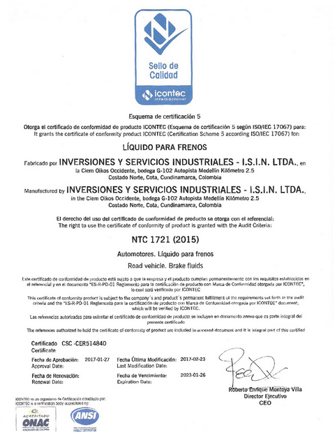 2006 - ISIN se convierte en la única empresa del mercado con Sello de Calidad NTC 1721 para el Liquido para Frenos
